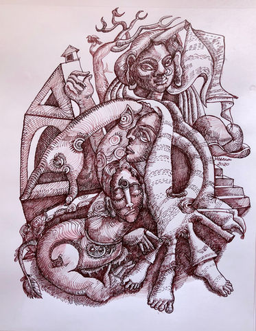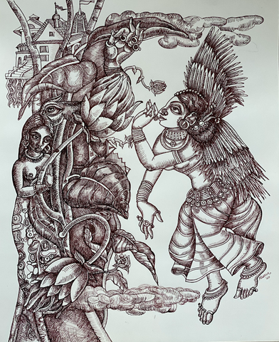 The figures that emerge carry the same preoccupations as the oil paintings, but compressed into a different pressure: the Meghadootam's cloud messenger moving between worlds; bodies in a village that have grown into each other and into the earth until the boundary between person and place has dissolved; the Navagunjara — that impossible creature from the Odia Mahabharata, assembled from nine animals into a single form that Arjuna must decide whether to worship or destroy; an apsara and a bee, fused at the threshold between the celestial and the biological.